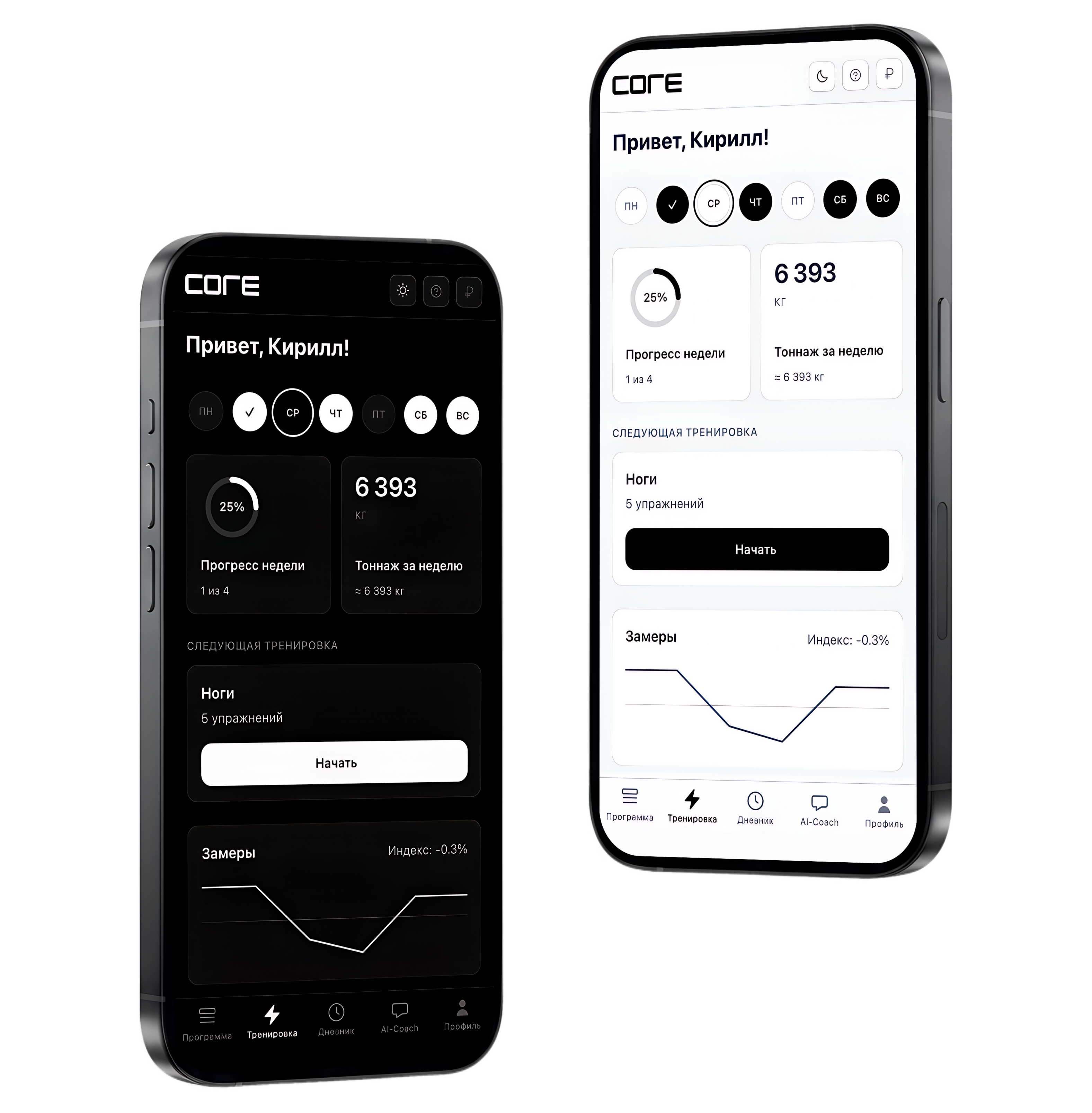 В первую очередь CORE — это умный трекер: подходы, веса, повторения, история и аналитика прогресса. AI помогает сверху: подсказывает и упрощает планирование.